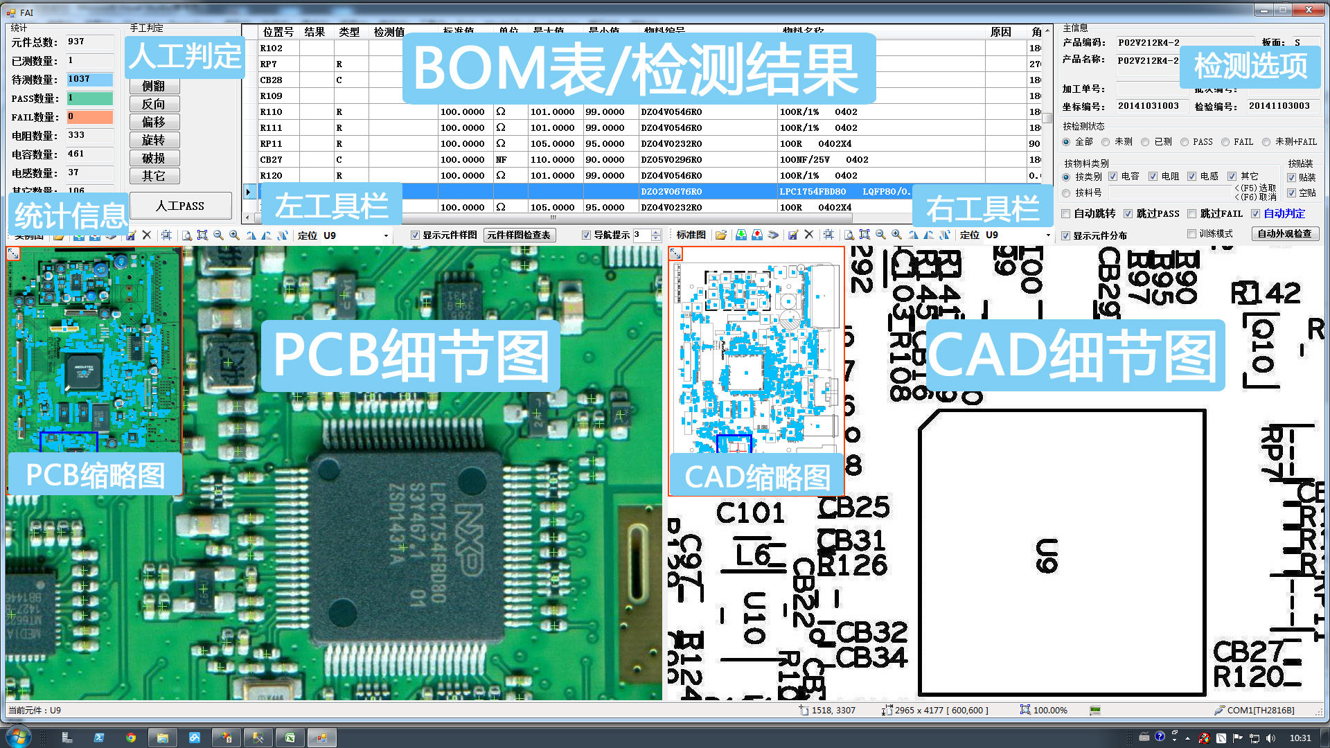 上圖是檢測(cè)程序主界面,左圖為待測(cè)PCB實(shí)物圖,右圖為待測(cè)PCB的設(shè)計(jì)圖(也可以是樣板圖),除此之外還包含了BOM表、統(tǒng)計(jì)信息、檢測(cè)選項(xiàng)等。測(cè)試過程中左邊的圖形與右邊的圖形均會(huì)自動(dòng)同時(shí)定位到當(dāng)前元件,并且可以自動(dòng)讀取實(shí)測(cè)值,自動(dòng)對(duì)比和記錄測(cè)試結(jié)果,對(duì)于IC等元件也可直接通過程序進(jìn)行絲印對(duì)比,這就大幅提升檢測(cè)的效率。
